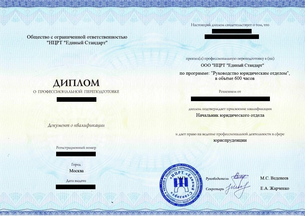 • «Начальник юридического отдела» с правом работы в сфере юриспруденции