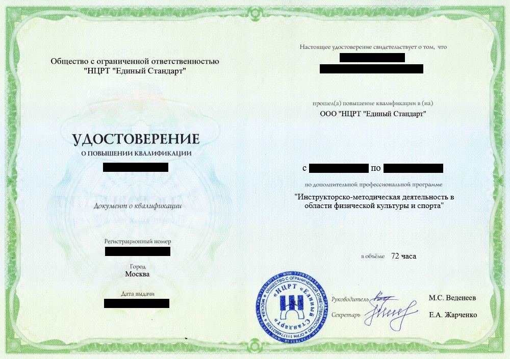 - Удостоверение о повышении квалификации установленного образца. Срок действия: 3 года