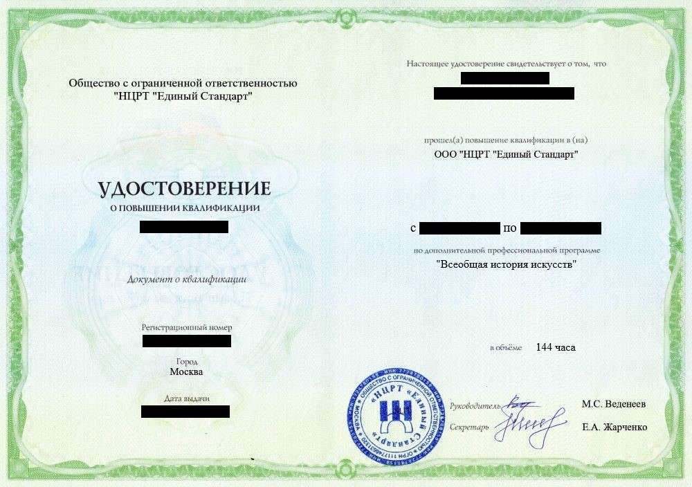 • Удостоверение о повышении квалификации установленного государством образца. Срок действия: 5 лет